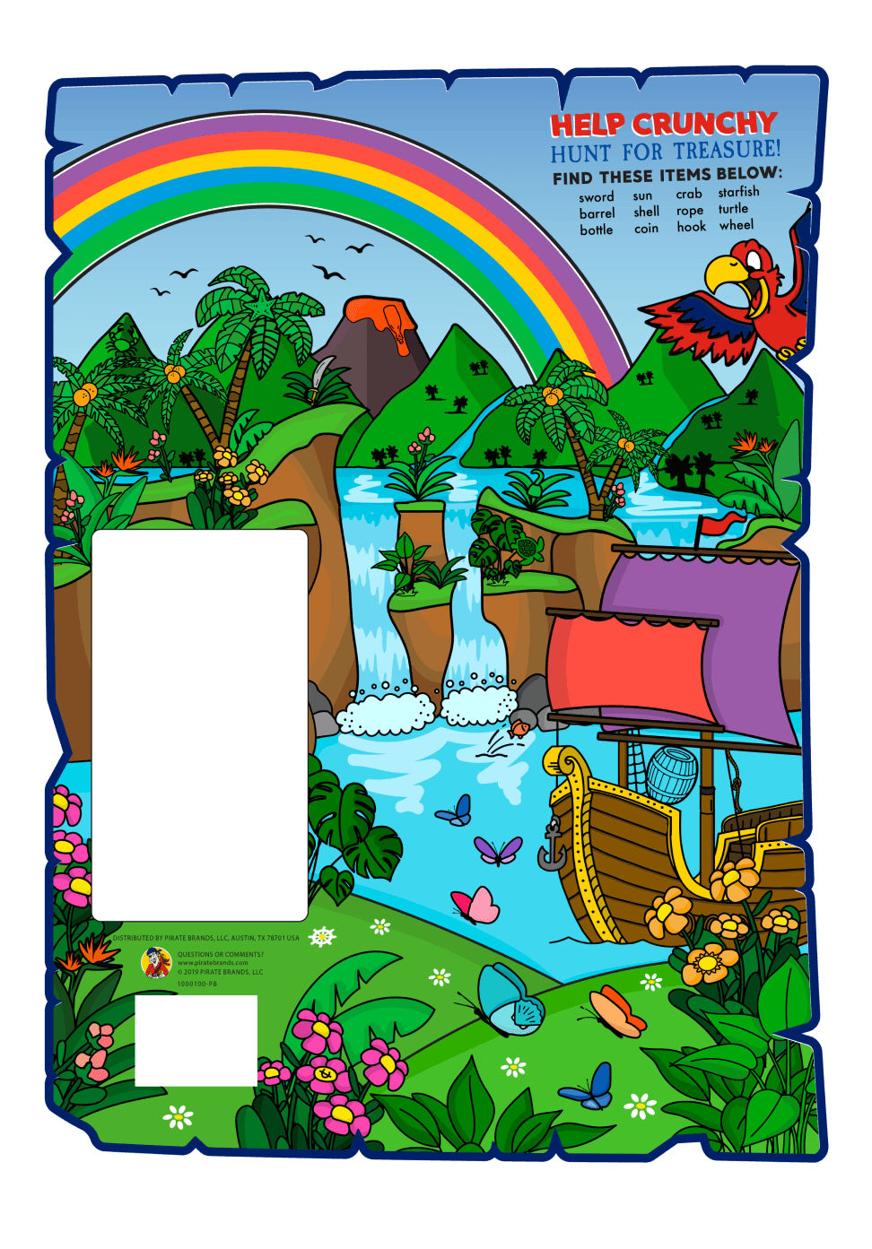 Pirate's Booty has earned acclaim for its captivating 'back of pack' details, often featuring engaging puzzles for audiences to decipher. In crafting this illustration, I aimed to amplify the color theme by seamlessly extending the rainbow from the front of the pack, creating a luxuriant and vivid scene of concealed objects for audiences to delight in discovering.