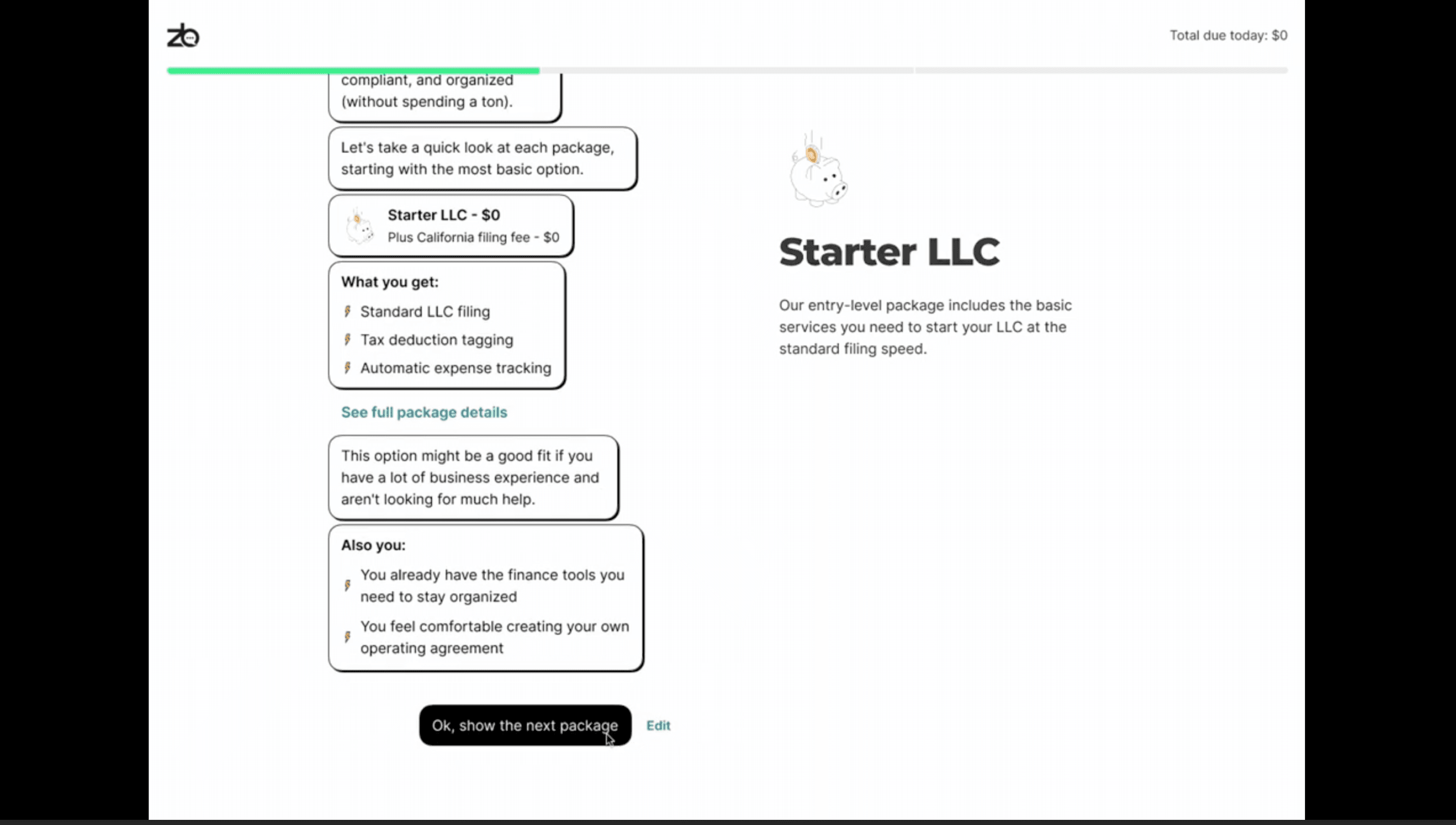 Zenbuisness presents an easy to understand solution to setting up an LLC. Whether it’s your first business, or your 100th, the LLC formation flow should be easy to navigate and understand. The current new user flow (from when the customer clicks into the website to start a new business, to selecting a package) is convoluted and hard to compare different levels of service/packages with one another.