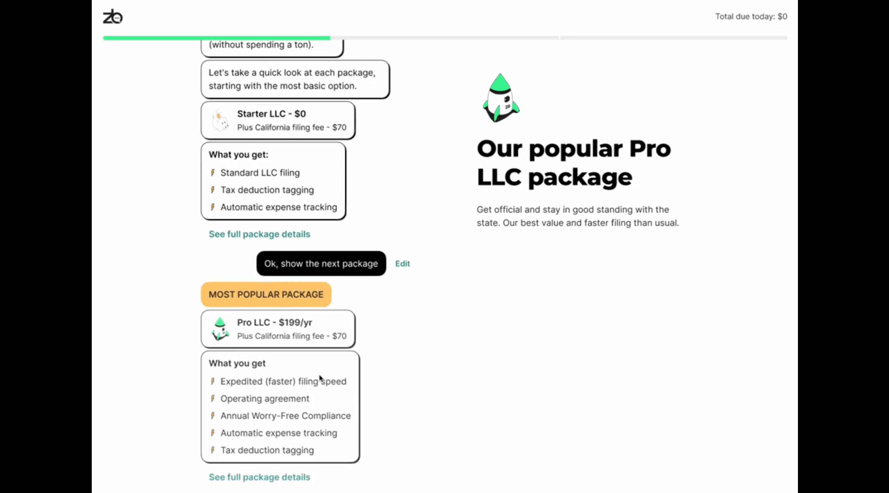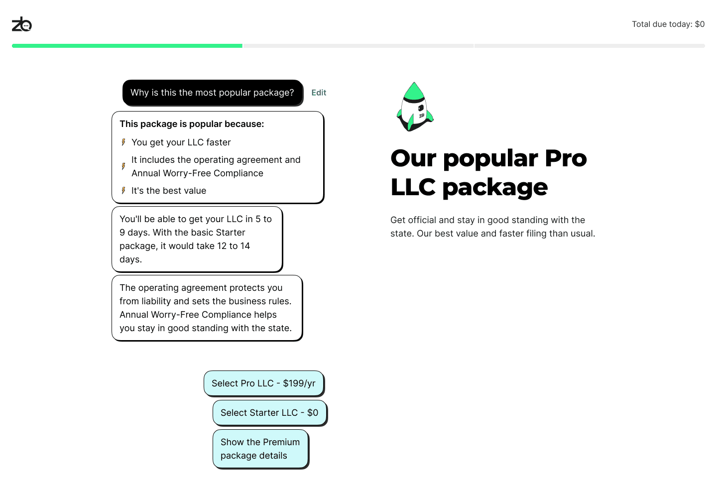 The ‘Pro’ package was the overall most recommended package by ZenBusiness, but not the most selected. We need to adjust the way information is laid out in the flow in order to more explicitly suggest the most recommended package.
